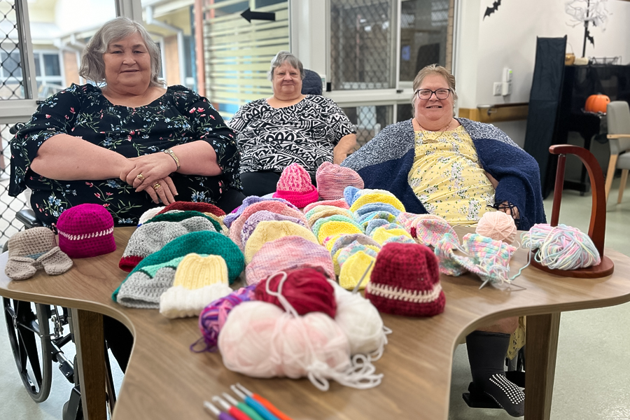 Three thoughtful, generous and kind aged care residents at Kippa Ring have turned their hands to good use by making lovingly crafted caps for premature babies and cancer patients.