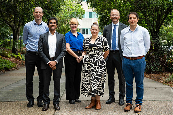 (L-R) Professor Steven Lane (Executive Director Research), Dr Dharmenaan Palamuthusingam, Dr Michelle Roets, Dr Deanne August, Nick Steele (Chief Executive), and Dr Gianluigi Li Bassi. Dr Julian Williams (not pictured) was unable to attend.